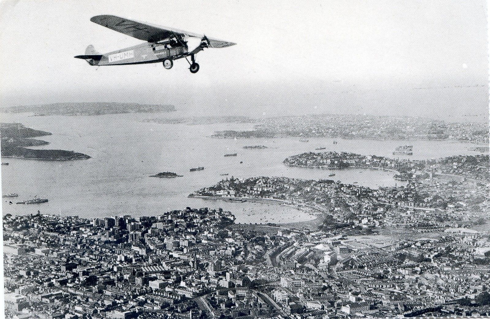 AUSTRALIAN NATIONAL AIRWAYS - AVRO 618 TEN - OVER SYDNEY - POSTCARD VIEW