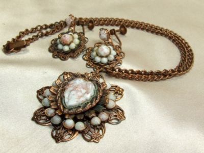 Vintage Copper Aventurine Milk Glass Necklace Earrings