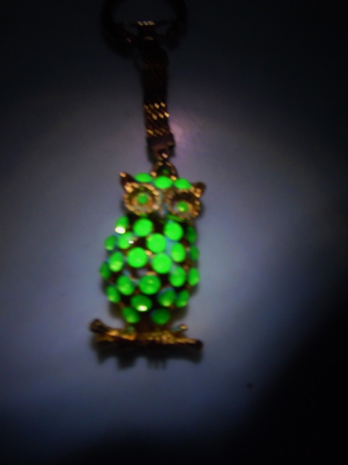 Title (ebay affiliate link): VINTAGE VASELINE GLASS OWL,SOLID RHINESTONES,KEY CHAIN -PENDANT,GLOWS N BLK.LGT.