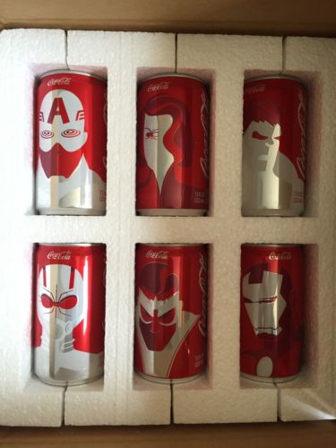 Title (ebay affiliate link): Marvel Avengers Mini Coca Cola Cans Complete Set 6 pack Coke First Edition