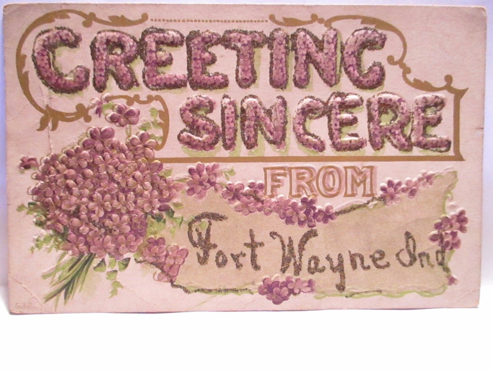 Title (ebay affiliate link): 1910 HIGH EMBOSSED LARGE LETTER GLITTER POSTCARD GREETING FROM FORT WAYNE IND