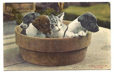 Title (ebay affiliate link): Postcard, Three Dogs and a Cat in a Flower Pot (5 1/2" x 3 1/2")