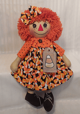 Title (ebay affiliate link): Handmade Primitive Button Eye Raggedy ANN Doll in HALLOWEEN CANDY CORN Dress