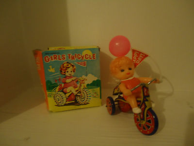 Vintage wind-up tricycle tin toy girl balloon bell, box
