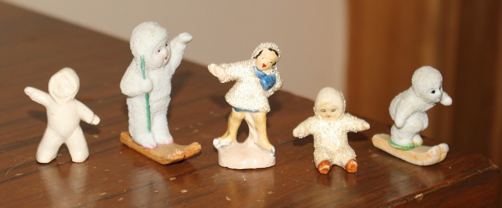 Title (ebay affiliate link): Two Snow babies, Two skiers. One girl ice skater. All miniture figures.