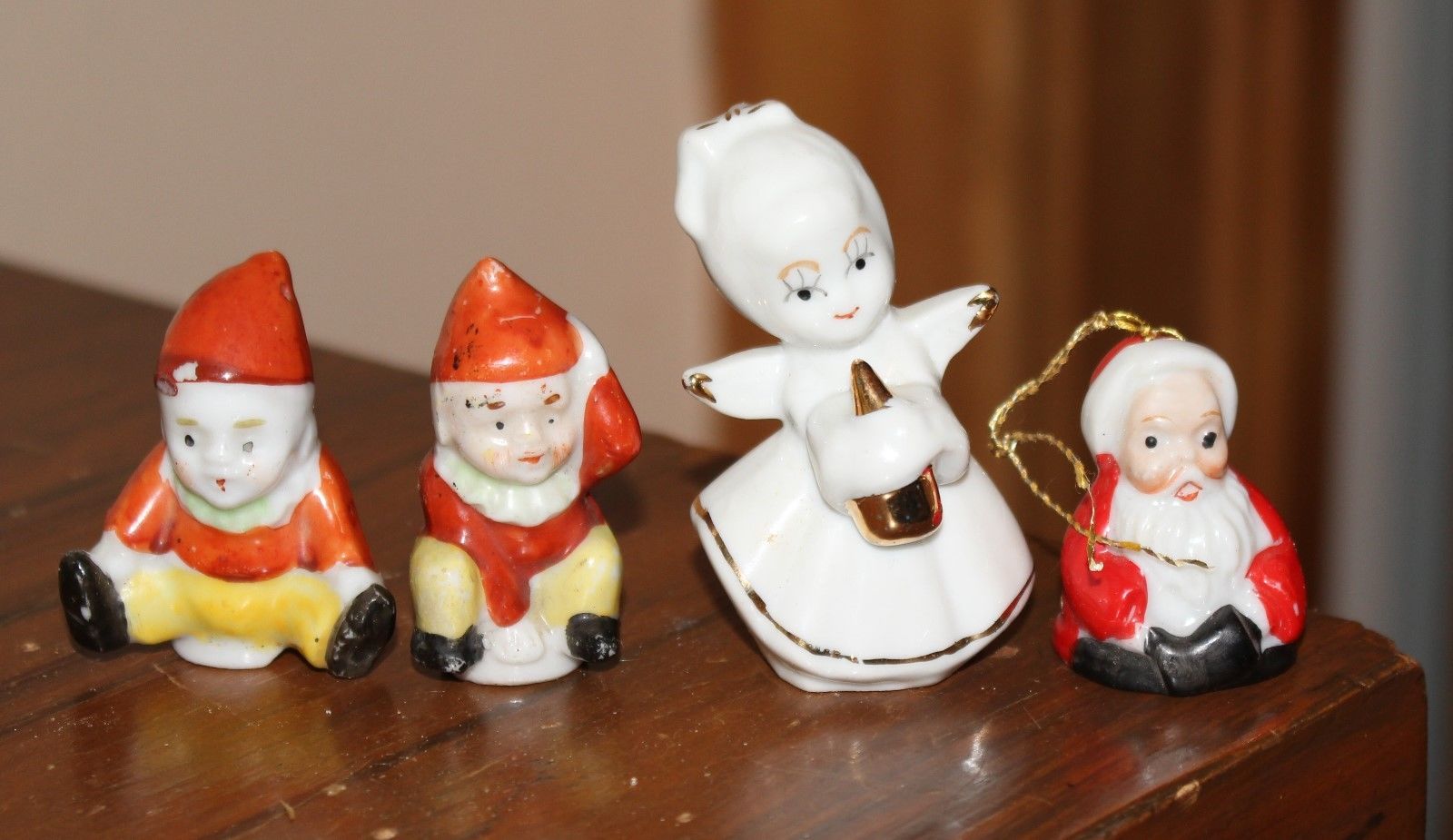 Elf Salt and Pepper Shakers. Angel with Horn. Santa Claus Bell. All Miniatures.