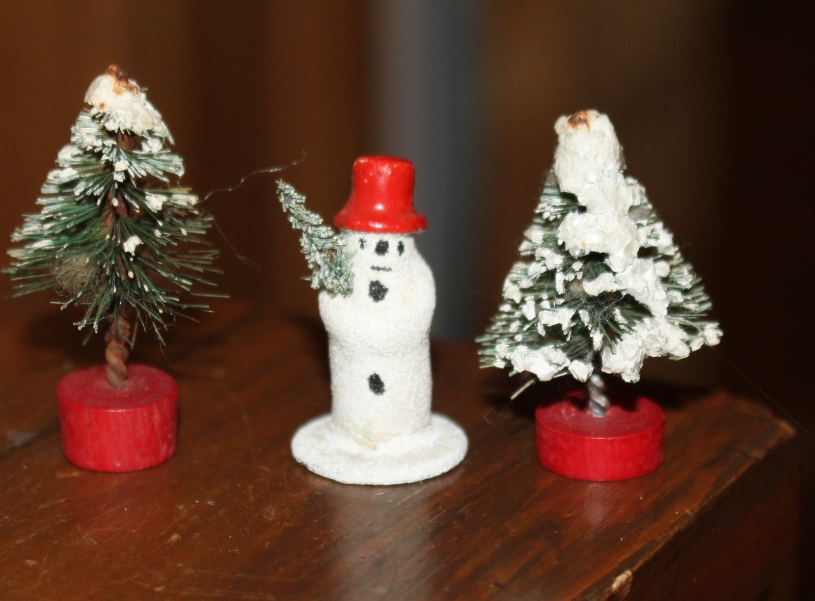 Title (ebay affiliate link): Miniature Composition snowman. Germany. Two Miniature Brush Trees. Japan