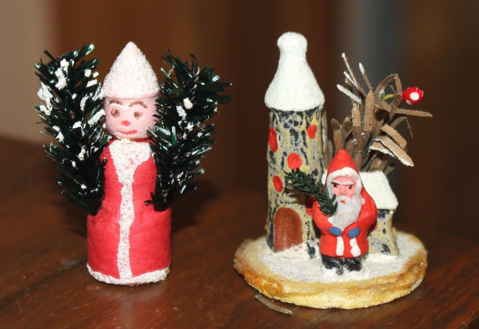 Title (ebay affiliate link): Two Miniature Santa Claus figures. Germany. One with Tower. One with Trees.