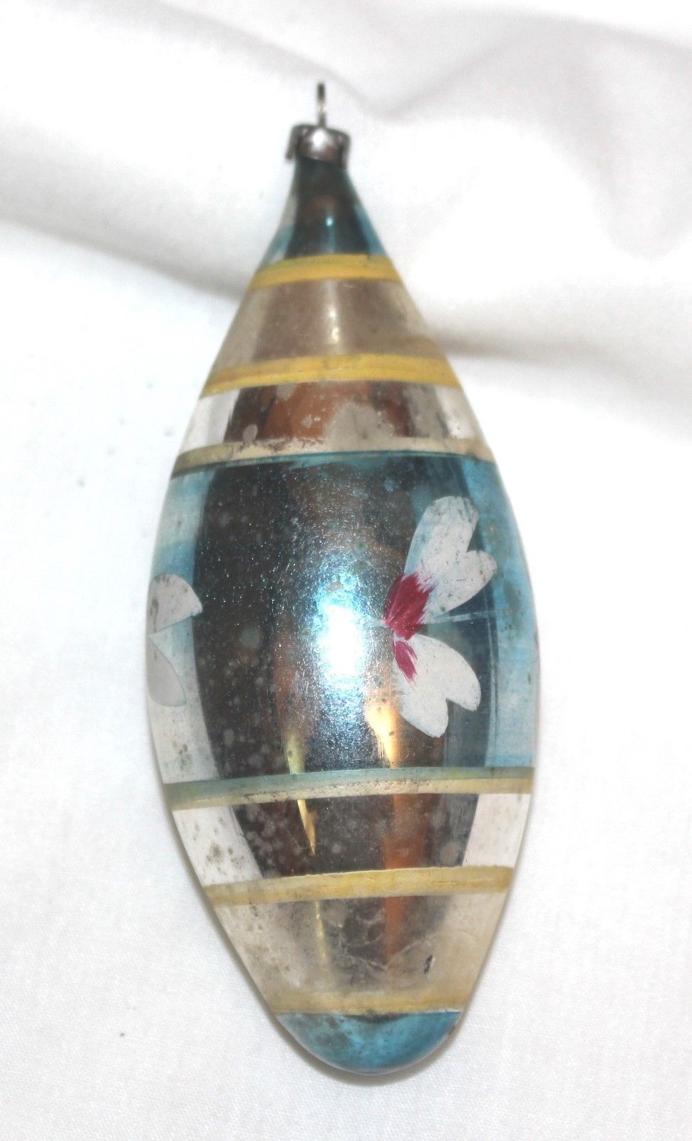 Title (ebay affiliate link): White Flowers, Blue & Yellow Stripes. Glass Oval. Early 1900s German Xmas Orn