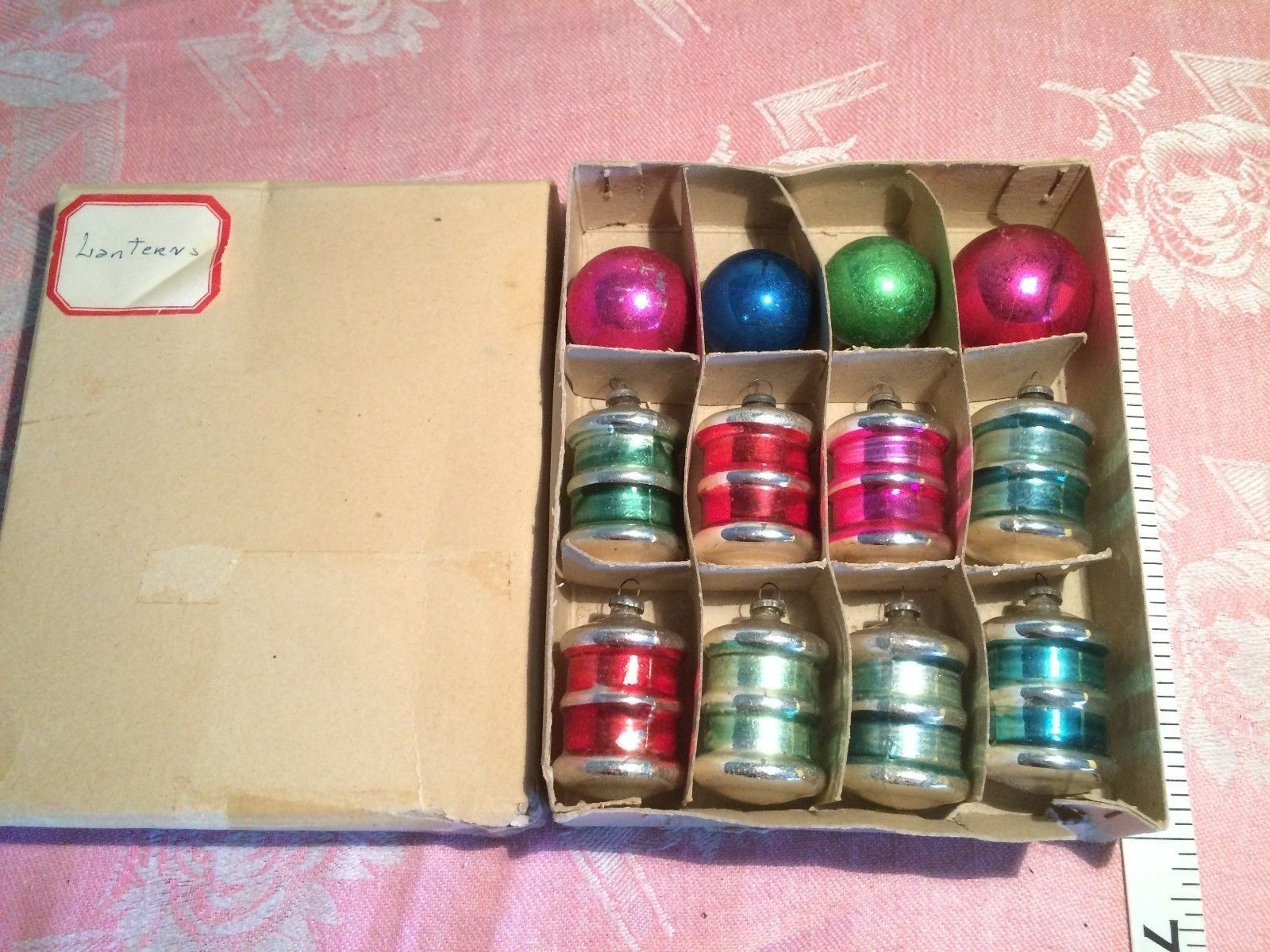 Title (ebay affiliate link): 8 VTG FEATHER TREE XMAS 1 1/2" MERCURY GLASS JAPAN COLORED LANTERN ORNAMENT BOX