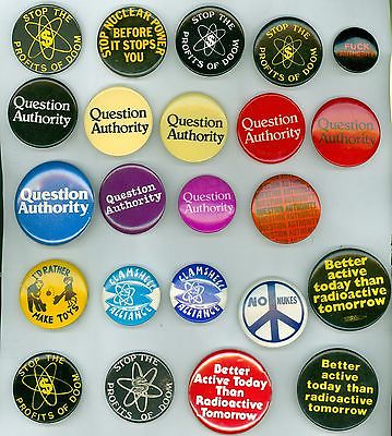 Title (ebay affiliate link): 23 Vintage 1970-90's Peace & Social Justice Pinback Buttons - Question Authority