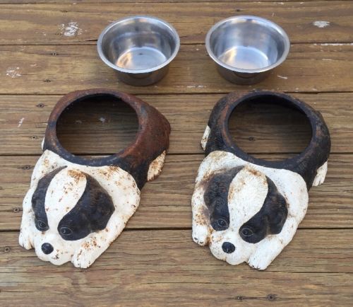 Title (ebay affiliate link): Pair Vintage Cast Iron Dog Bowls, Sheepdogs, Original Paint, Nice Patina!