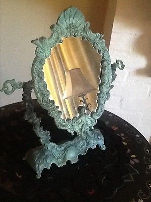 Title (ebay affiliate link): VINTAGE CHERUB VANITY TABLE MIRROR ORNATE DESIGN ANTIQUE GREEN METAL