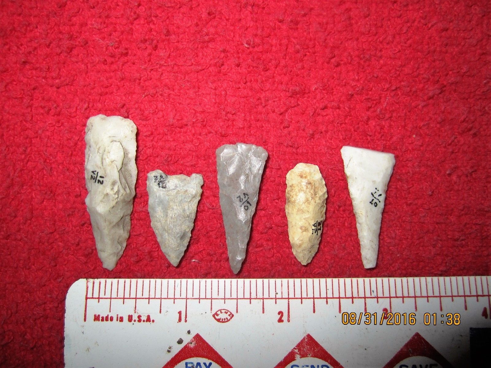 LOT OF 5 TRIANGULAR & NODENA ARROWHEADS ( BURNETT, HORICON MARSH, WISCONSIN )