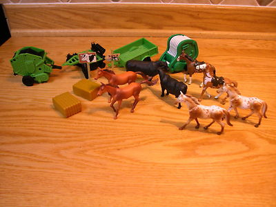 15 New Ray Horses, Cows, hay, wagon, bailer,disc, signs