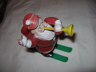 Vintage hard plastic santa on skis with yellow horn