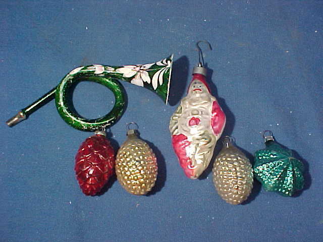 Title (ebay affiliate link): 6-1920s PAINTED Glass FIGURAL CHRISTMAS Tree ORNAMENTS Clown-Pine Cones-Horn +