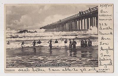 B&W Vintage UDB Postcard-Beach with People & Pier-Waves Long Beach CA in 1905-VF