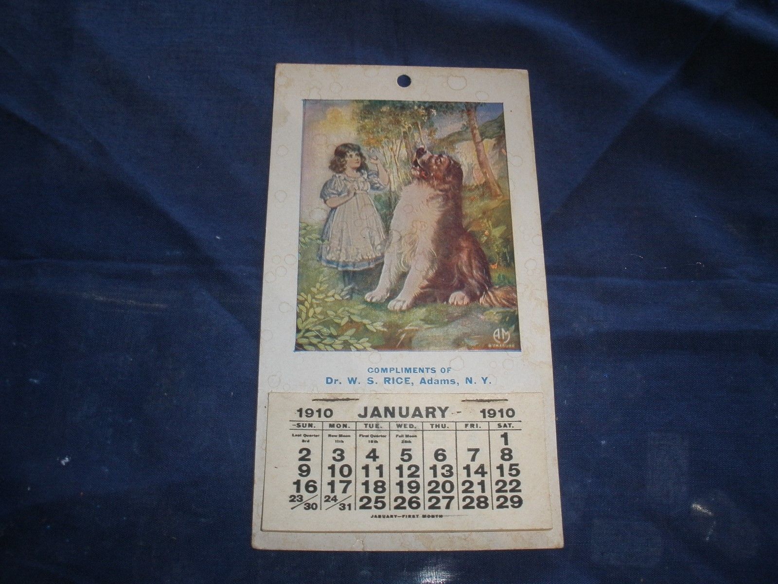 Title (ebay affiliate link): 1910 Adams New York Advertising Calendar Dr W. S. Rice AM Syracuse St Bernard