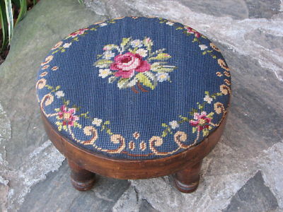 VINTAGE FLORAL NEEDLEPOINT ROUND FOOTSTOOL