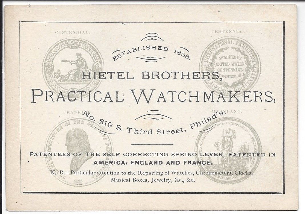 c1876 Trade Card, Hietel Bros., Watchmakers, Centennial Exhibition Exhibitors