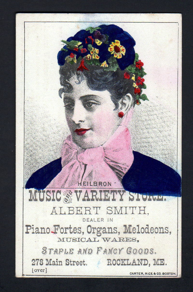 Title (ebay affiliate link): 1800s TRADE CARD FROM COLLECTION - SMITH MUSIC - ROCKLAND ME - Hand Colored
