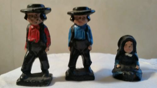 Title (ebay affiliate link): Vintage MINIATURE Cast IRON? Amish Figurines ~ 2 Men ~ Girl for wagon? Blue Red