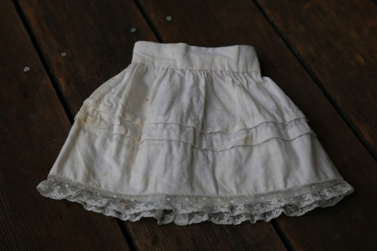 Title (ebay affiliate link): Lovely Antique Small White Cotton DOLL PETTICOAT Half Slip Pleats Dainty LACE