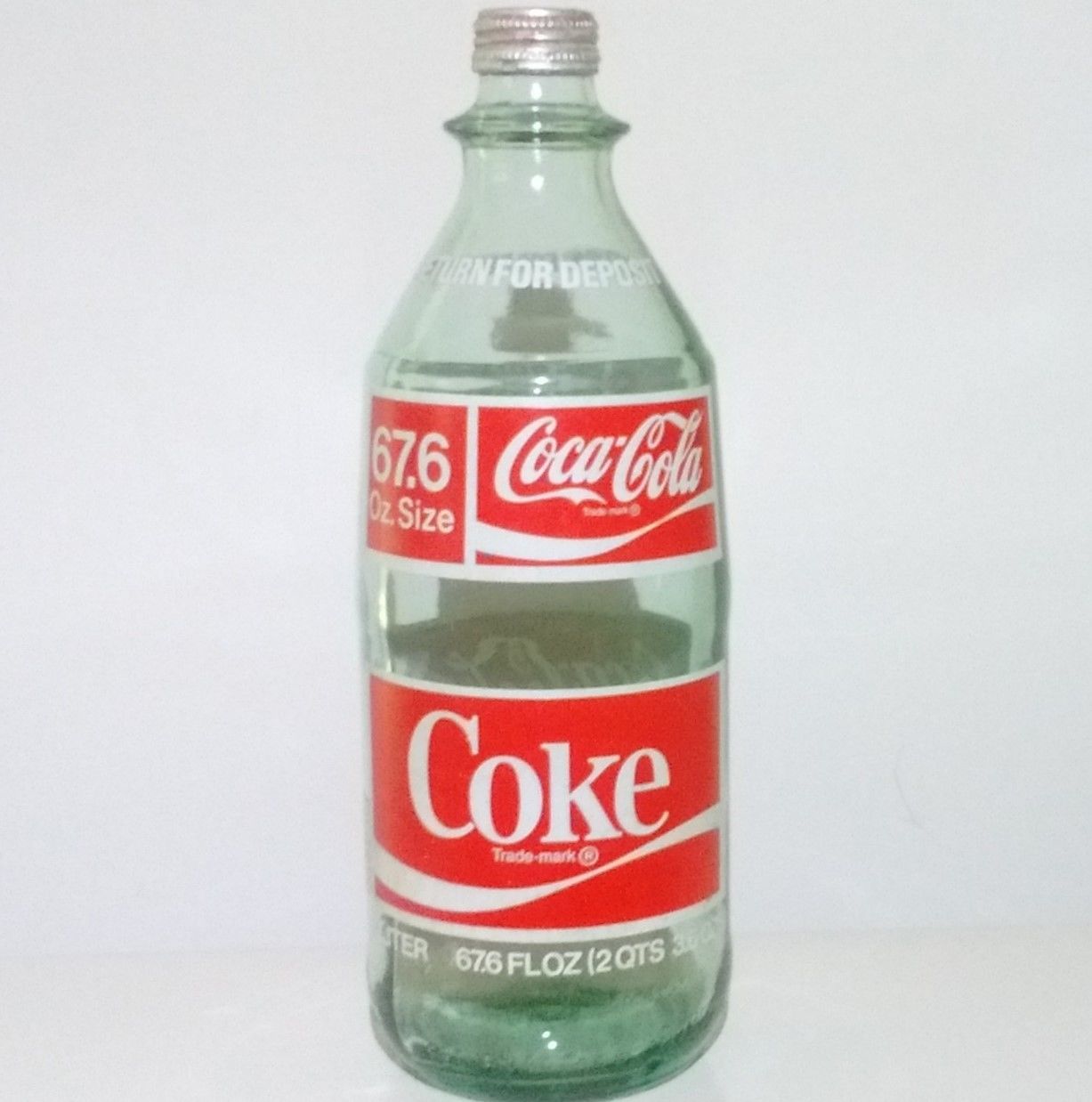 Title (ebay affiliate link): 1970's 67.6 oz 2 Liter Coke Coca-Cola Green Glass Bottle w/ Lid Very Clean.