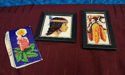 Mid century Folk art Native American Glass Bead Framed panels set of 3