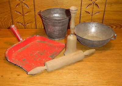Old Country Miniature Rolling Pin Masher & Small Tin Bowl Bucket & Dust Pan