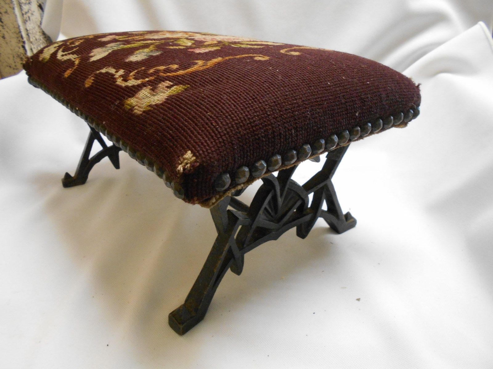Vintage art deco Needlepoint roses cushion Foot Stool with Cast Iron Legs