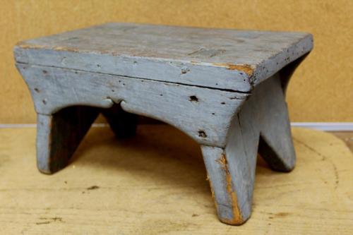 Title (ebay affiliate link): 19TH C WOODEN FOOT STOOL IN OLD BLUE PAINT WITH BOOT JACK SIDES SCALLOPED SIDES