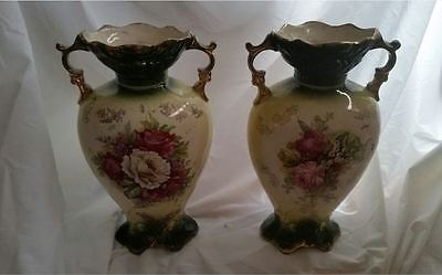 PAIR OF VICTORIAN / EDWARDIAN VASES WITH TWIN HANDLES & FLORAL DESIGN -11" tall