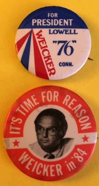 Title (ebay affiliate link): Two Lowell Weicker (CT) for President Campaign Pin Pinback Buttons