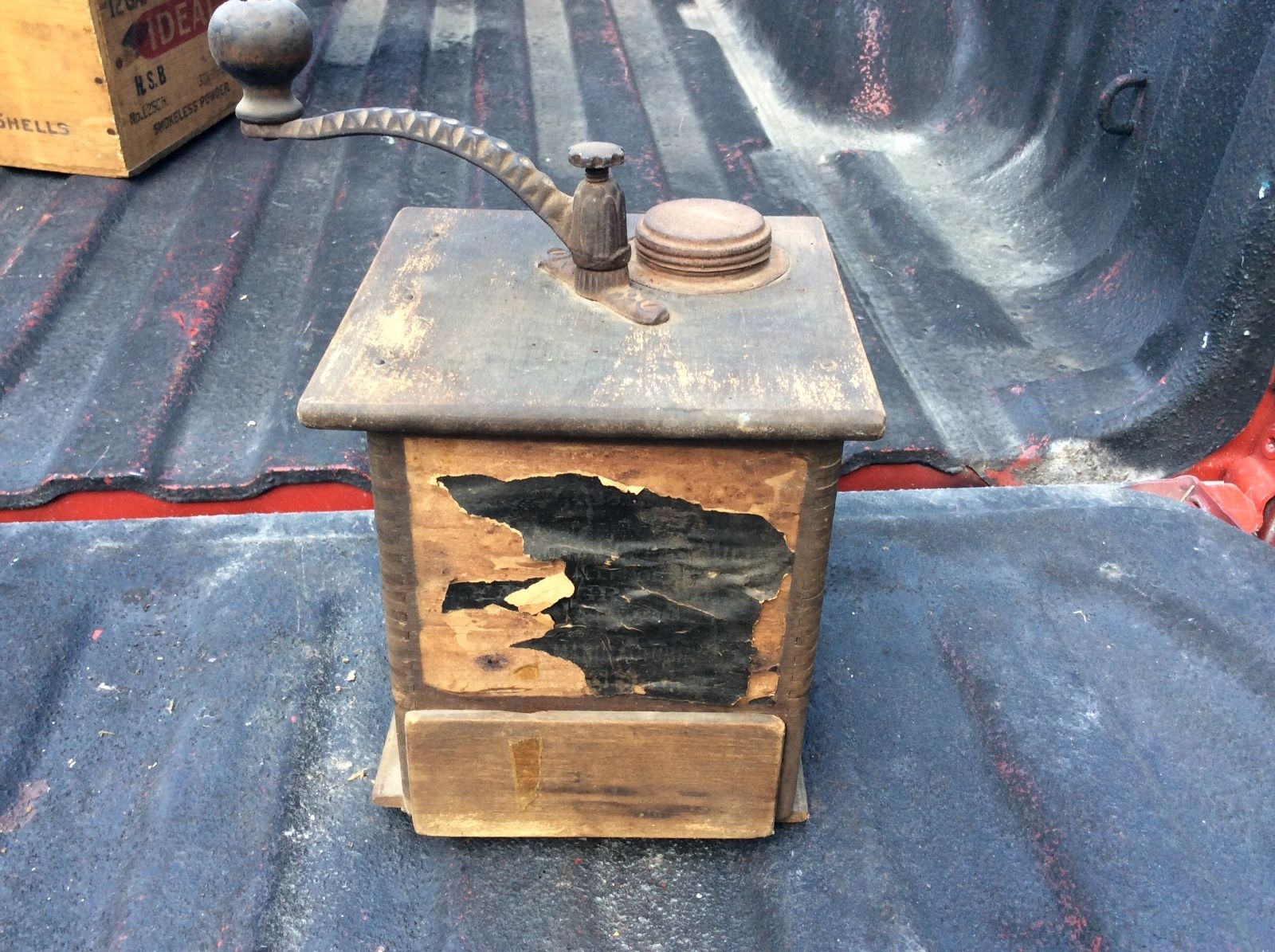 Title (ebay affiliate link): Antique Wood Dovetailed Tall Hand Crank Coffee Bean Grinder Estate Find