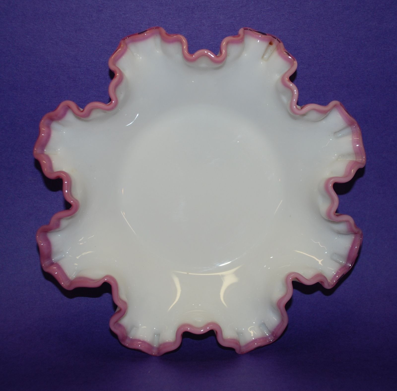Title (ebay affiliate link): VINTAGE WHITE MILK GLASS WITH PINK RUFFLED EDGE CANDY BOWL DISH