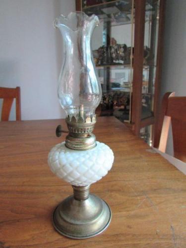 Title (ebay affiliate link): Vintage miniature milkglass oil lamp with chimney & wick - 9" tall