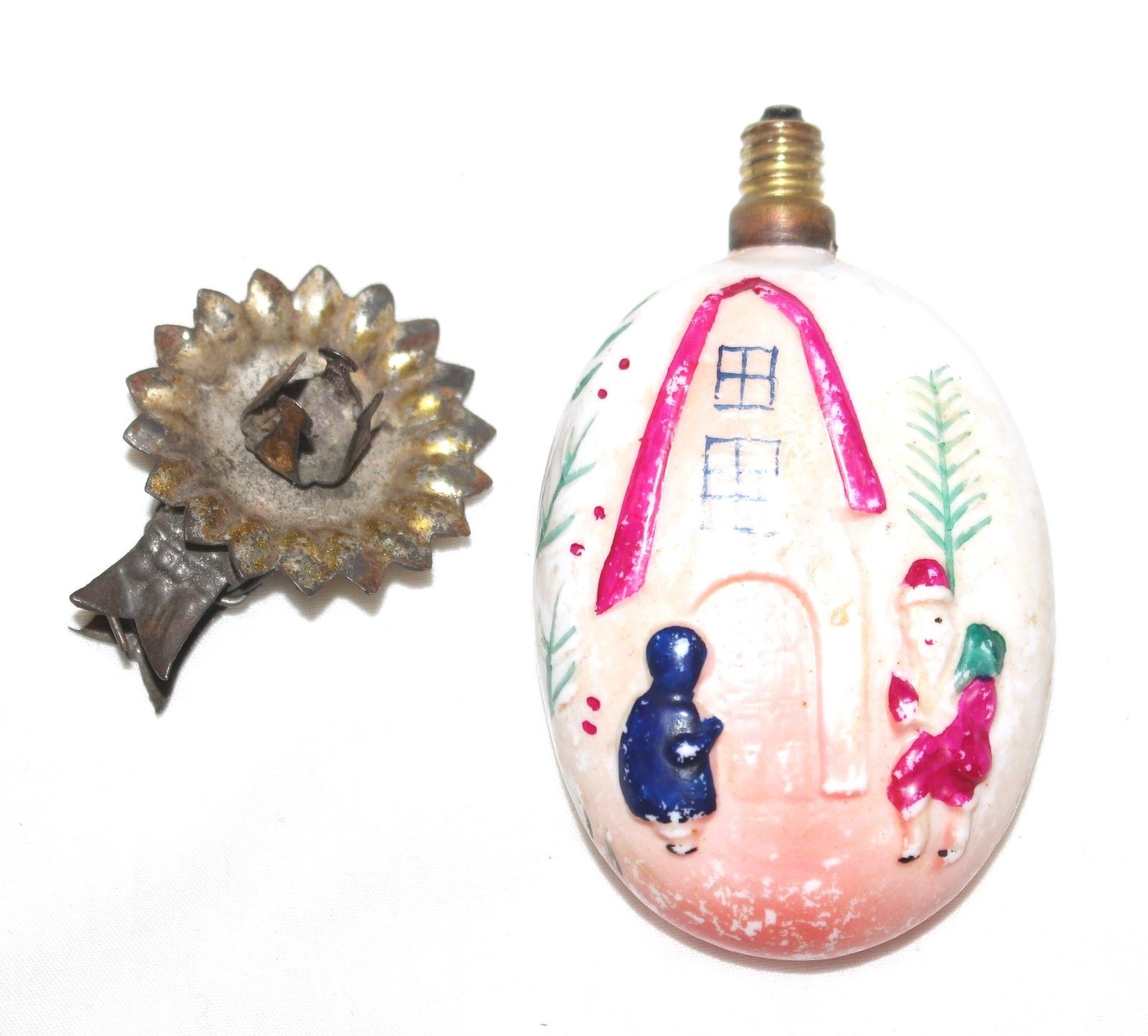Title (ebay affiliate link): Cameo, Santa with Girl by House. Figural Bulb C-6 base. Milkglass. Not Working.