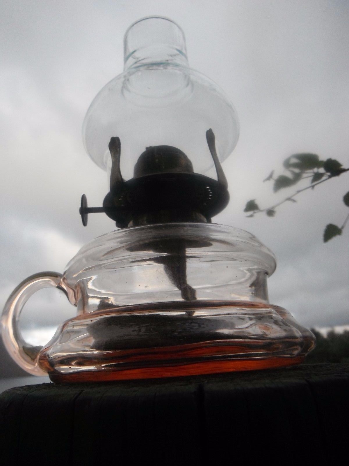 Title (ebay affiliate link): Vintage Oil/Parafin Lamp - Peach Coloured Glass Base With Handle. Nice Chimney.