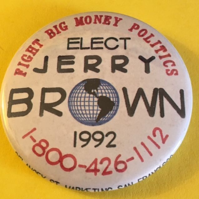 Title (ebay affiliate link): Elect Jerry Brown Fight Big Money 1992 Political Campaign 2 1/4 Inch Pin Button