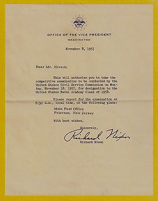 Title (ebay affiliate link): 1957 letter signed Vice President Richard Nixon USCSC exam for USNA & FF cover