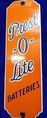 PORCELAIN SIGN PREST O LITE BATTERIES ORANGE 23 X 7 CMS