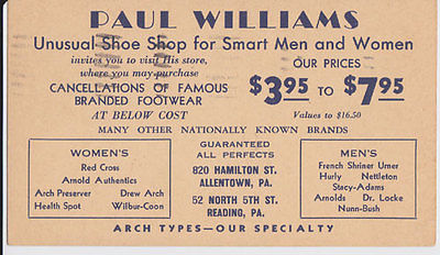 PAUL WILLIAMS "Unusual" Shoe Shop Advertising Postcard Allentown & Reading PA