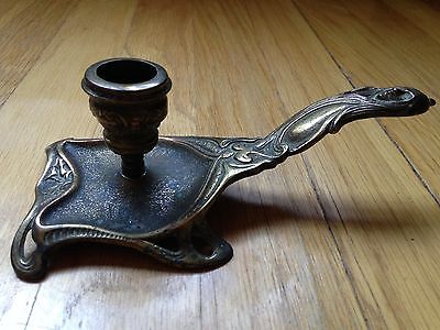 ANTIQUE ART NOUVEAU BRASS FIGURAL HANDLED CHAMBER CANDLESTICK