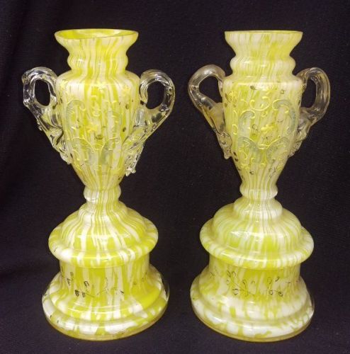 Pr. Victorian Enamel Spatter Bohemian Art Glass Trophy Vases