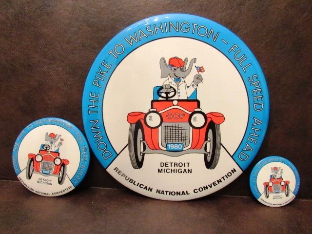 HUGE 9" DOWN THE PIKE 1980 DETROIT REPUBLICAN CONVENTION PINBACK WITH 2 SMALLER