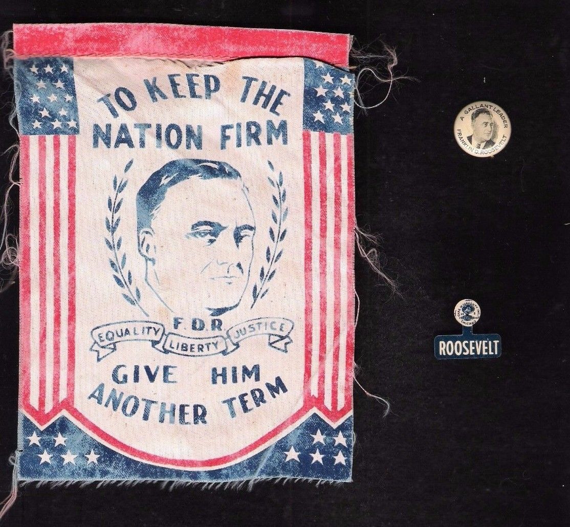 Title (ebay affiliate link): 3 FDR Franklin D Roosevelt 1940s campaign items: photo flag + 2 buttons