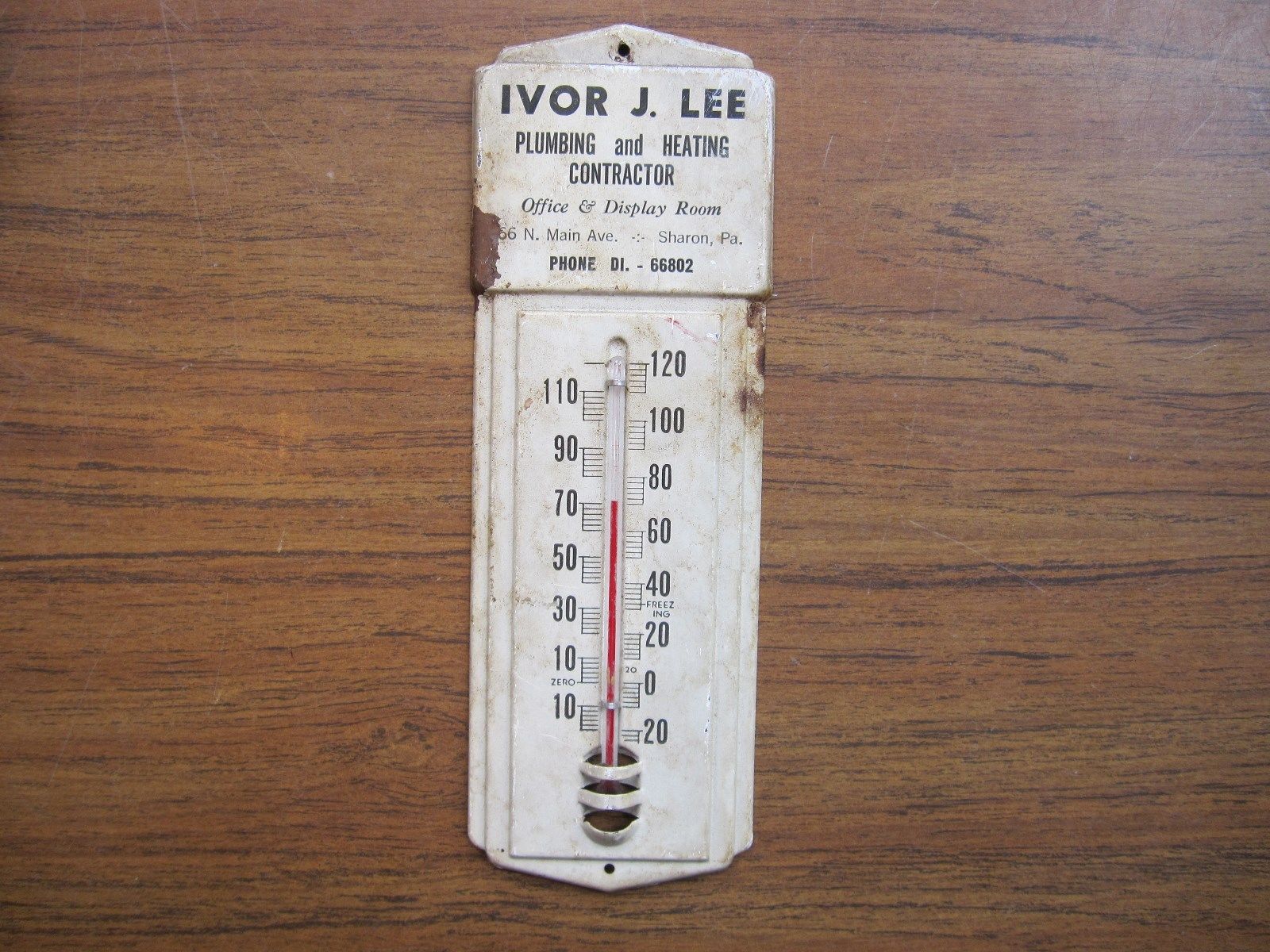 VINTAGE Advertising thermometer for Ivor J. Lee, Plumber Sharon, Pa. metal, 8"