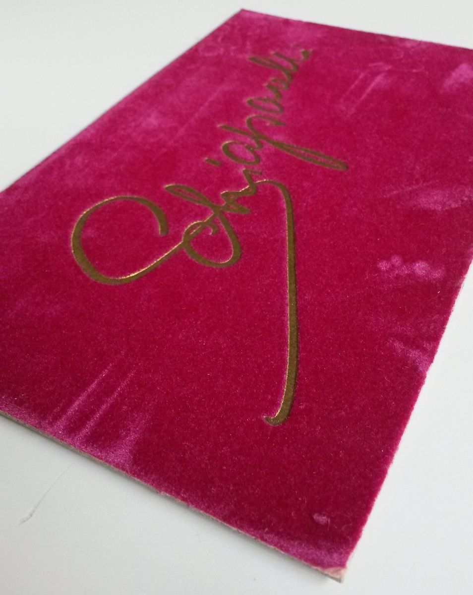 Title (ebay affiliate link): Vtg Schiaparelli Fuchsia Velvet Cardboard Sign Jewelry Advertising Store Display